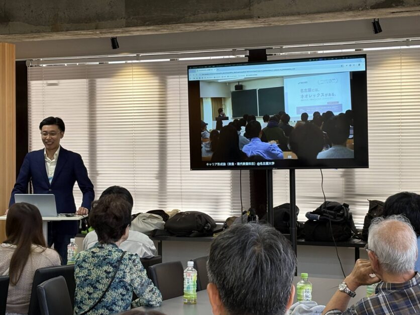 新卒採用への取り組みや、名古屋大学や京都大学との連携、中学校のキャリア授業への参加、企業での出張Excel講習など、写真を交えてたくさんの活動の様子を紹介してくれました。