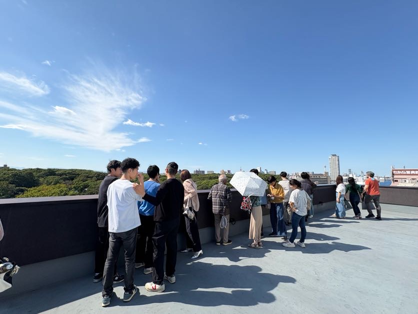 5階のオフィスフロア、そして熱田神宮が一望できる屋上へ実際に移動し見学しました。ご家族のみなさんも景色や、神宮の森をバックに、写真を撮って楽しんでいました。