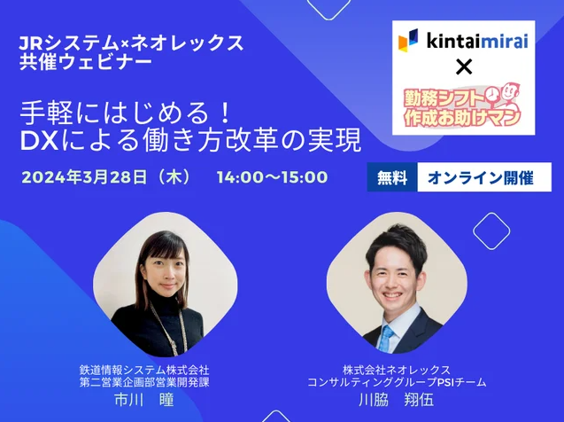 鉄道情報システム株式会社(本社:東京都渋谷区、代表取締役社長:本多 博隆、略称:JRシステム)は、株式会社ネオレックス(本社:愛知県名古屋市、代表取締役社長:駒井 拓央、以下「ネオレックス」)と、共催ウェビナー『手軽にはじめる!DXによる働き方改革の実現』を開催いたします。