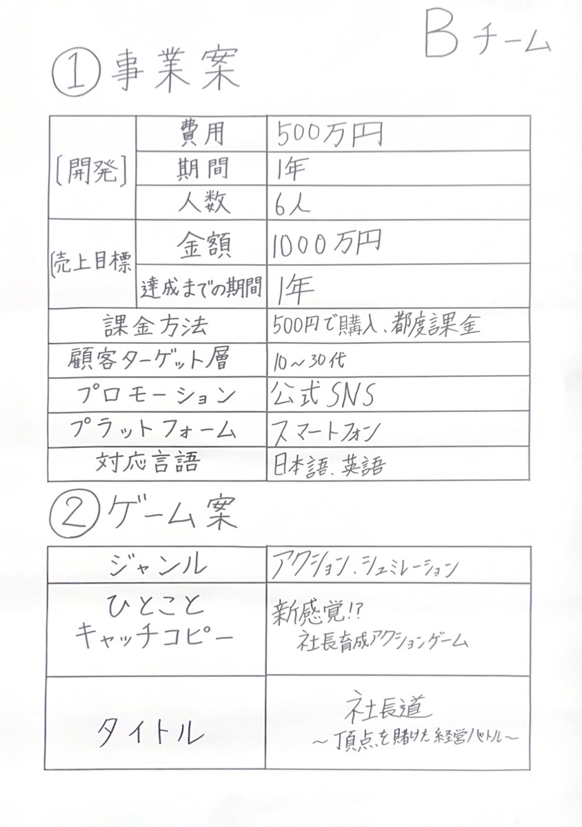 当社が担当したグループでは、IT企業の業務体験として「ゲームの企画書づくり」に取り組みました。